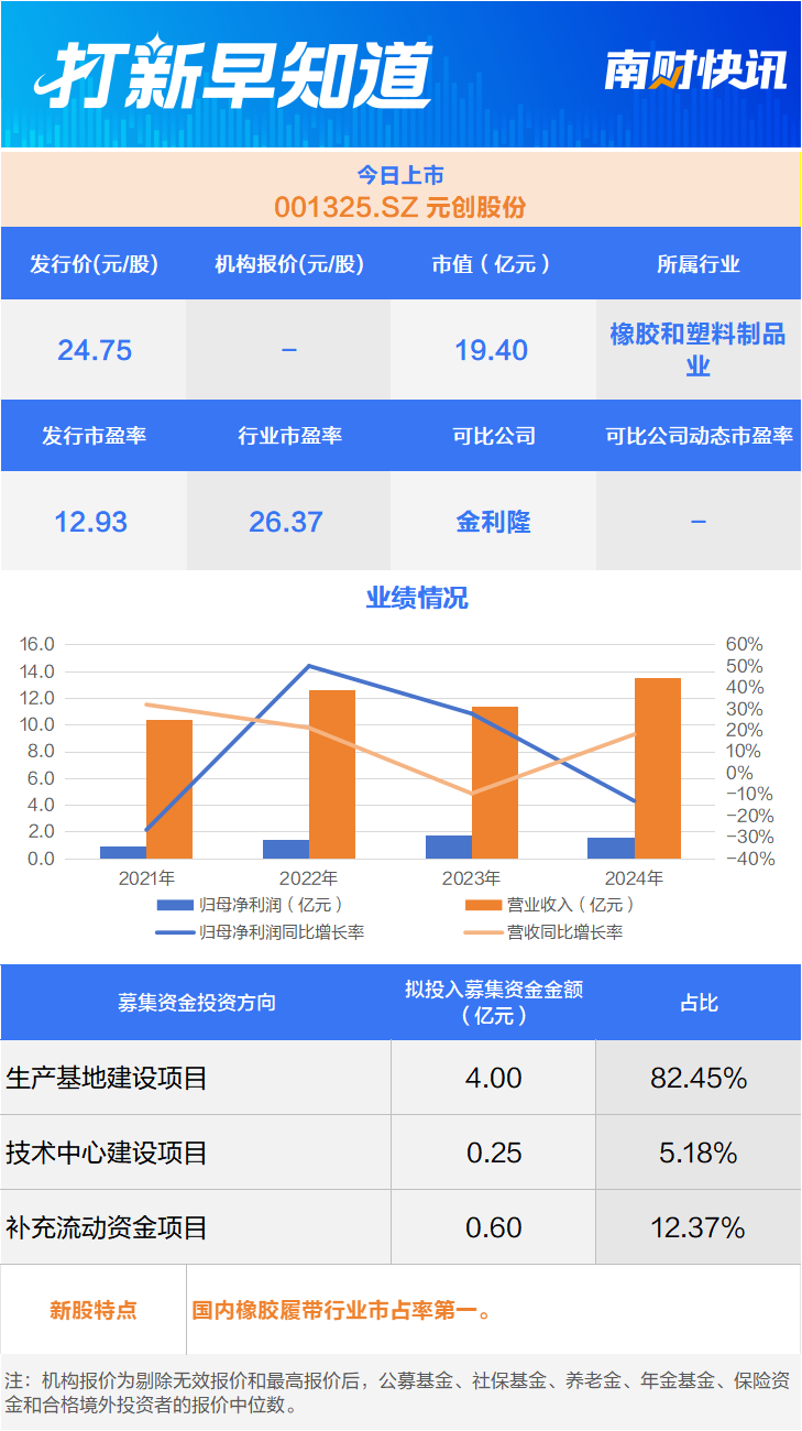 12月18日,有一只新股上市最大的证券公司,为深市主板的元创股份(001325.SZ)。该公司主营橡胶履带类产品的研发、生产与销售,主要产品包括农用机械橡胶履带、工程机械橡胶履带和橡胶履带板。产品作为联合收割机、挖掘机、装载机、摊铺机等多种履带式农用或工程机械的行走部件,最终应用于农业生产、工程施工等不同应用领域。